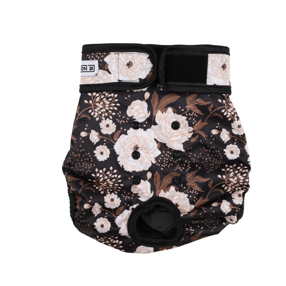 Dit beige loopsheidbroekje met bloemendesign is speciaal ontwikkeld voor teefjes tijdens de loopsheid, bij incontinentie of na een operatie. De 6 absorberende lagen nemen vocht direct op, terwijl de elastische anti-lekranden en de waterproof buitenlaag doorlekken voorkomen. Dankzij de drukknopen verstelbaar in lengte en breedte, zodat het altijd comfortabel zit. Herbruikbaar, machinewasbaar op 40 °C en geschikt voor honden van Chihuahua tot Berner Sennen.
