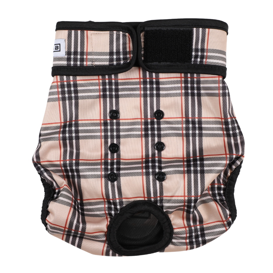 Loopsheidbroekje Beige Ruit – Wasbaar & verstelbaar voor teefjes bij loopsheid en incontinentie