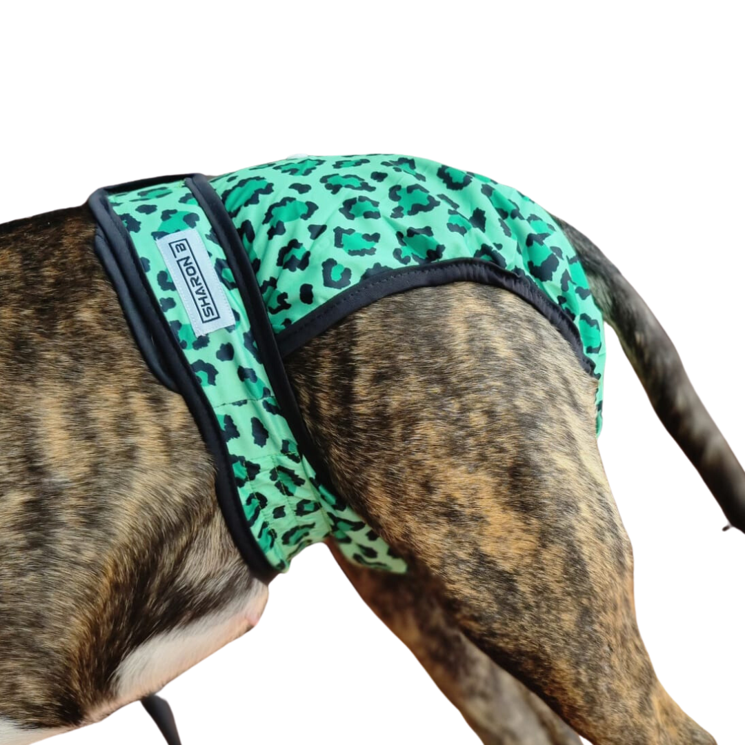 Dit groene luipaardprint loopsheidbroekje biedt bescherming bij loopsheid en incontinentie. 6 absorberende lagen houden vocht tegen, elastische anti-lekranden en waterproof buitenlaag voorkomen lekken. Met drukknopen verstelbaar, eenvoudig te wassen op 40 °C en geschikt van Chihuahua tot Mastin.