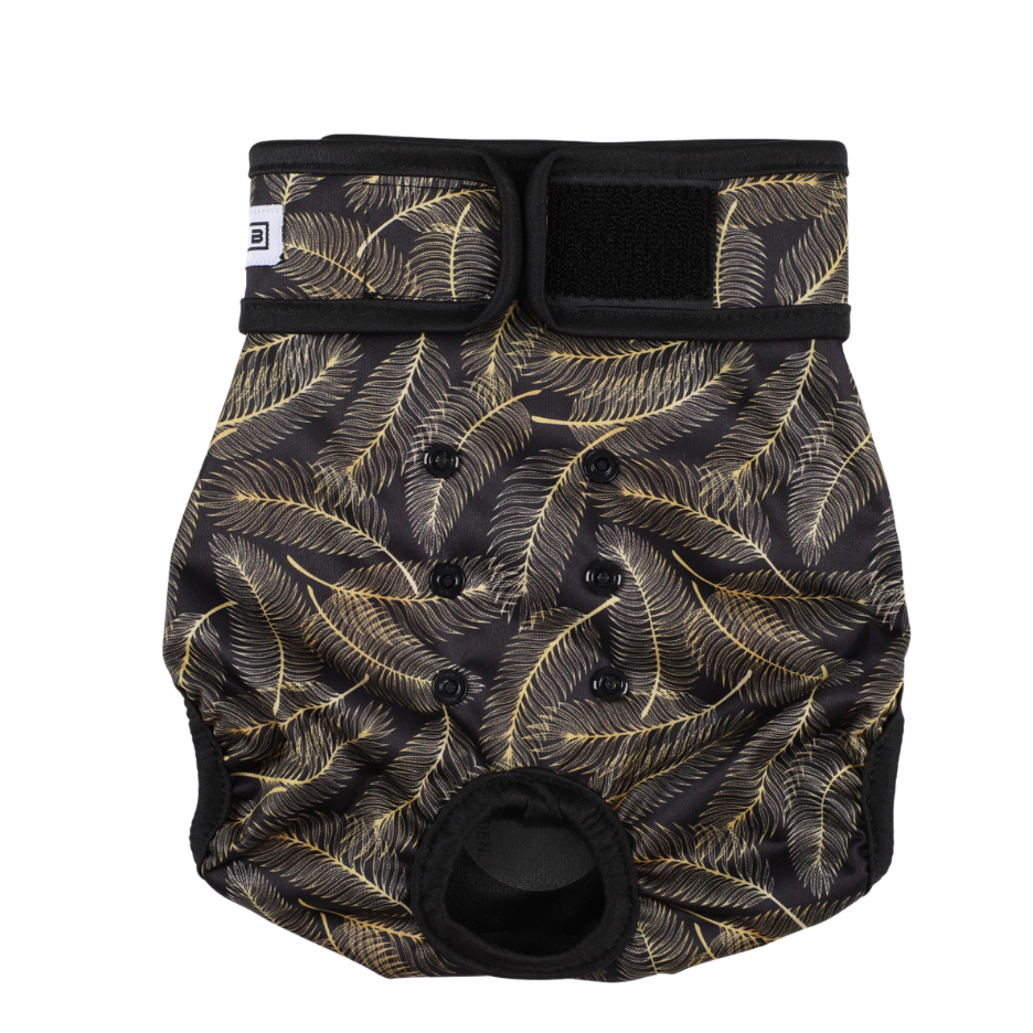 Loopsheidbroekje Zwart met Gouden Palmen – Verstelbaar & wasbaar voor teefjes bij loopsheid
