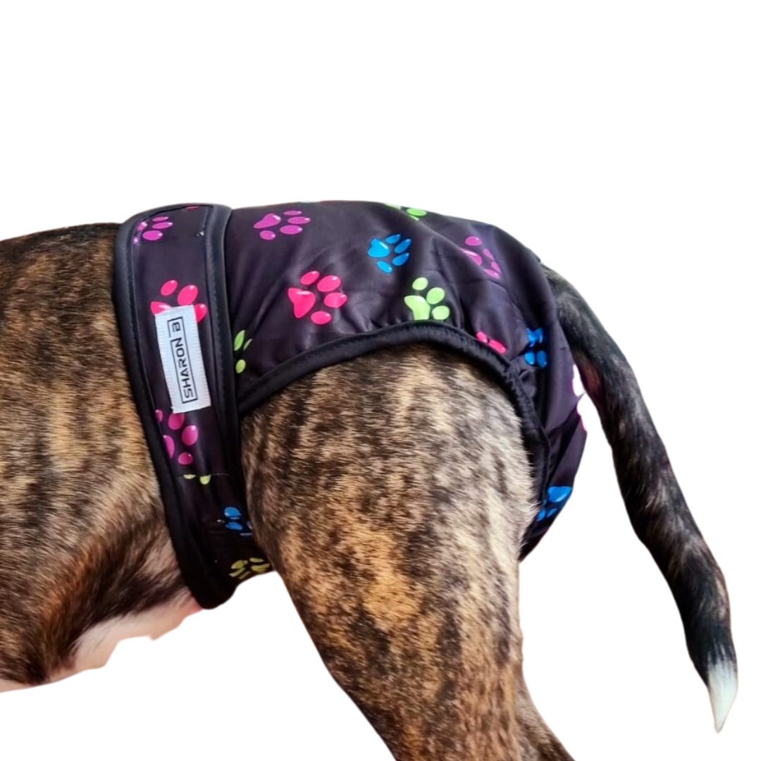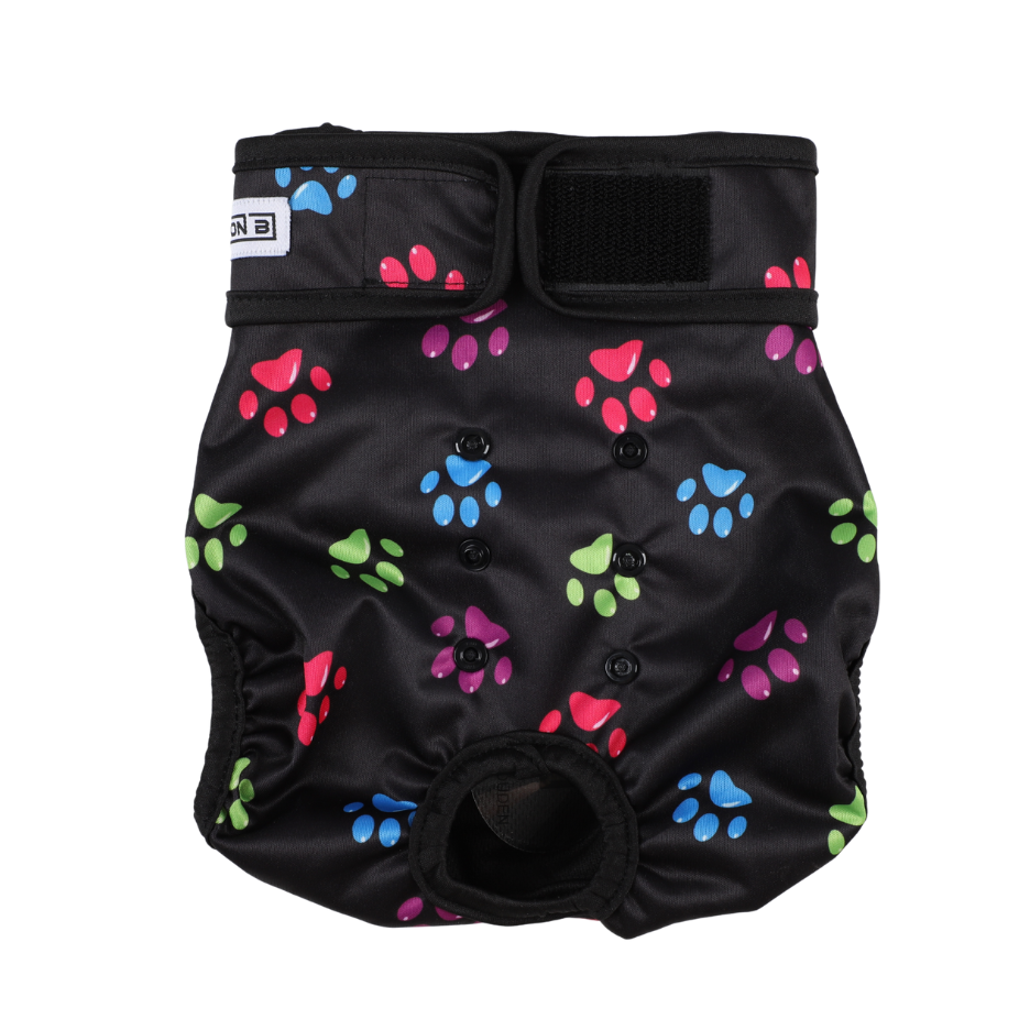 Met dit zwarte loopsheidbroekje met pootjesprint bescherm je je hond én je interieur. De 6-laags kern neemt vocht direct op, de elastische randen voorkomen doorlekken en de waterproof buitenlaag geeft extra zekerheid. Verstelbaar met drukknopen voor een ideale pasvorm, herbruikbaar en machinewasbaar. Geschikt van Maltezer tot Rottweiler.