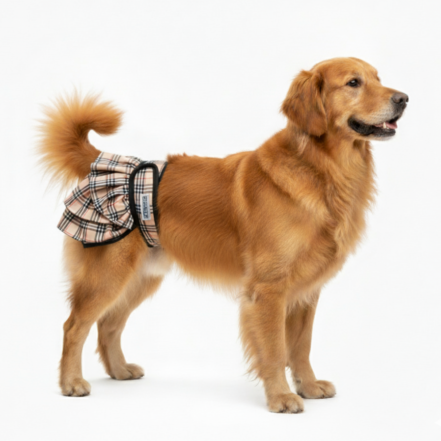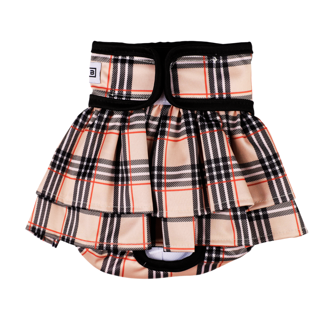 Loopsheidrokje Beige Ruit – Wasbaar & verstelbaar met klittenband voor teefjes bij loopsheid